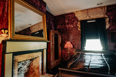Come stay with us in the Bride of Dracula Suite! Whether it is a honeymoon, romantic rendezvous or just a luxurious treat, this ultra-Gothic room will deliver. Satin sheets and a programmable noise-canceling machine invite you to sleep like the dead. Your own private bathroom (shower) is equipped with all of the bathing essentials including shampoo, conditioner, and body wash; we deliver quiet luxury.